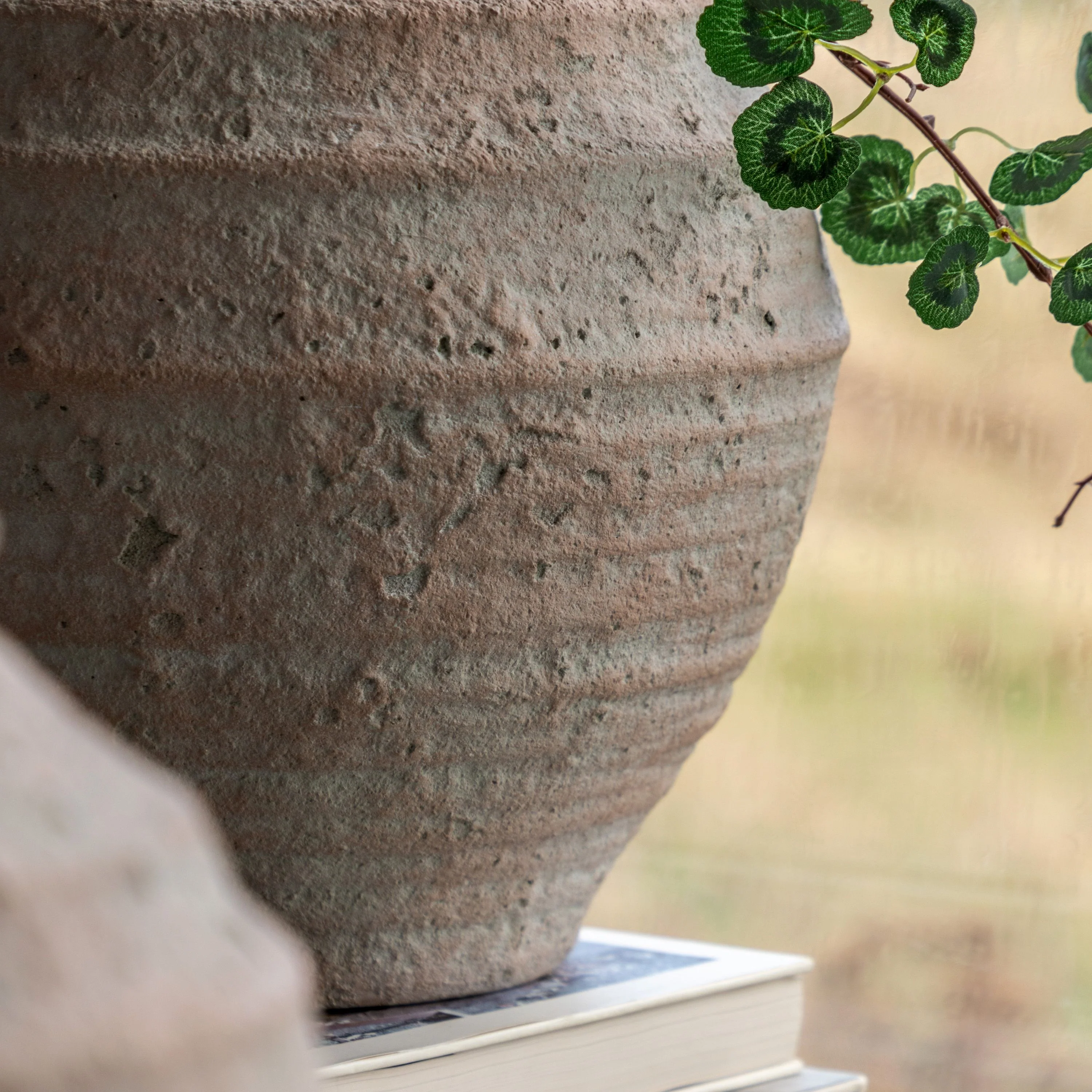 Bring a touch of antiquity to an interior with the rustic vase. In cement style ceramic, finished in a natural colour, this vase stands out as part of a display of faux stems or simply on its own.
